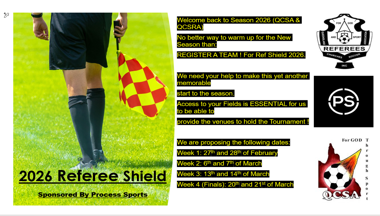 The Referees Shield is a pre-season competition run by QCSRA and sanctioned by the Association to provide an opportunity for QCSRA to train Referees and Assistant Referees for the upcoming QCSA season.