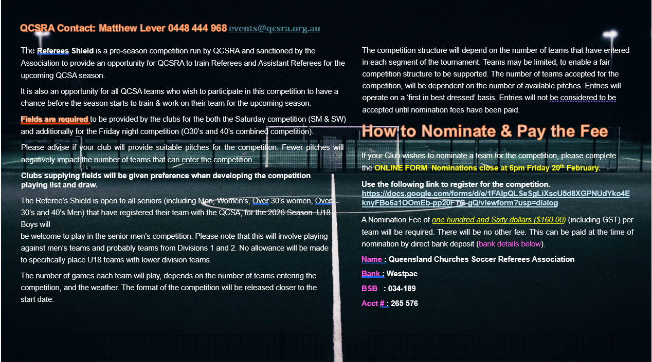 The Referee’s Shield is open to all seniors (including Men, Women’s, Over 30’s women, Over 30’s and 40’s Men) that have registered their team with the QCSA, for the 2026 Season. U18 Boys will be welcome to play in the senior men’s competition. Please note that this will involve playing against men’s teams and probably teams from Divisions 1 and 2. No allowance will be made to specifically place U18 teams with lower division teams.